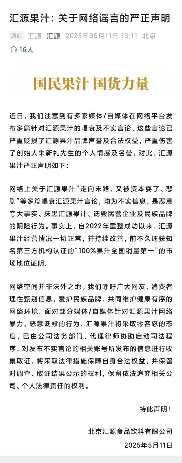 【导读】面对“走向末路”等不实传闻,汇源果汁发布严正声明,强调经营正常并启动法律维权